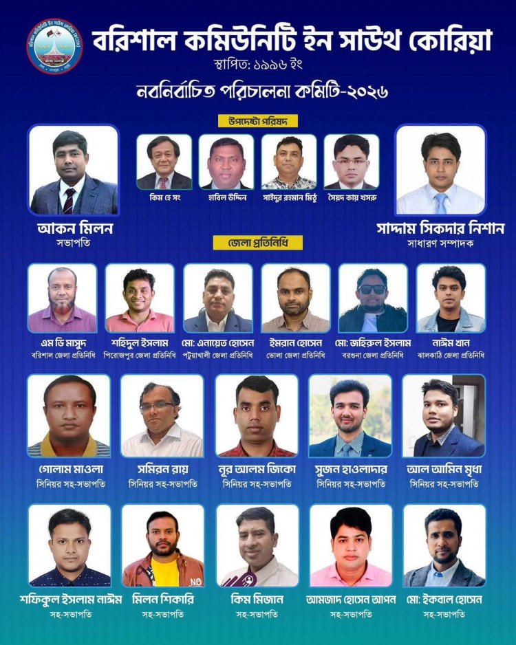 দক্ষিণ কোরিয়া: দক্ষিণ কোরিয়ায় বসবাসরত বরিশাল বিভাগের প্রবাসীদের সংগঠন “বরিশাল কমিউনিটি ইন সাউথ কোরিয়া” (স্থাপিত ১৯৯৬) এর ২০২৬ সালের নতুন পূর্ণাঙ্গ কমিটি আনুষ্ঠানিকভাবে ঘোষণা করা হয়েছে।